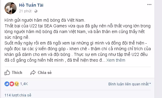 Trên trang mạng cá nhân lúc 0h ngày 2-9, tiền đạo Hồ Tuấn Tài viết tâm thư gửi người hâm mộ bóng đá Việt Nam. Anh viết: "Thất bại của U22 tại SEA Games vừa qua đã gây nên nỗi thất vọng lớn trong lòng người hâm mộ bóng đá nam Việt Nam, và bản thân em cũng thấy hết sức nặng nề".