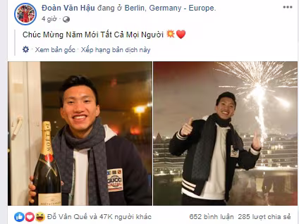 Sáng 1-1-2020, Đoàn Văn Hậu đăng hình ảnh chào năm mới trên trang cá nhân cùng dòng chia sẻ: "Chúc mừng năm mới mọi người!". Hậu vệ tuyển Việt Nam chia sẻ lên mạng xã hội lúc 1h20 phút (giờ Berlin, Đức).