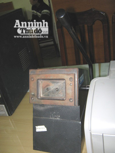 Máy dập thẻ tín dụng giả (trái) và lượng lớn thẻ tín dụng giả do nhóm của Cẩm sản xuất