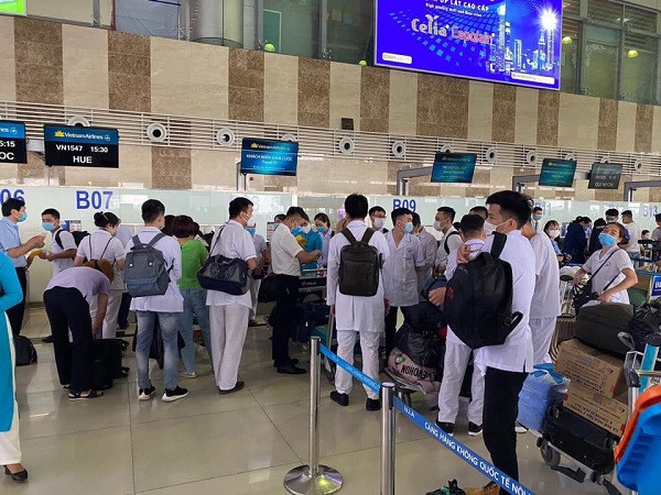 Đội ngũ cán bộ y tế từ các tỉnh thành tiếp được chi viện tới Đà Nẵng trong ngày 5-8