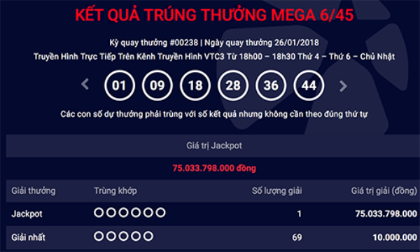 Công ty Xổ số điện toán Việt Nam (Vietlott) vừa xác định thêm một chiếc vé trúng giải Jackpot trị giá hơn 75 tỷ đồng tại kỳ quay thứ 238 xổ số Mega 6/45 diễn ra tối 26/1.