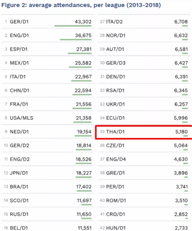 Cụ thể, CIES Football thống kê Thai League là giải đấu có số lượng khán giả trung bình tới sân cao nhất Đông Nam Á từ mùa 2013 đến 2018, với trung bình 5.180 người/trận. Con số này giúp Thai League đứng thứ 6 châu Á và thứ 35 trên thế giới.
