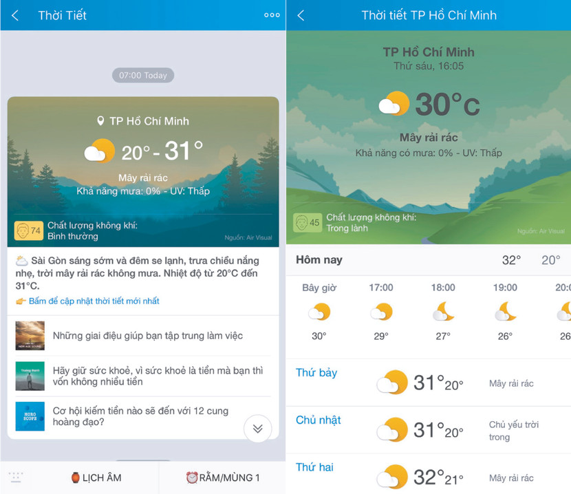 Giao diện Thời tiết được cập nhật thêm chỉ số chất lượng không khí và chỉ số UV theo thời gian và địa điểm thực tế