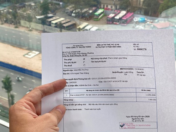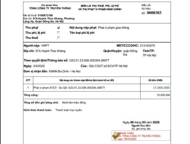 Mẫu biên lai sau khi nộp phạt vi phạm giao thông trực tuyến