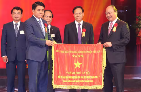 Thủ tướng Nguyễn Xuân Phúc trao tặng Cờ thi đua của Chính phủ cho TP Hà Nội, đơn vị dẫn đầu phong trào thi đua yêu nước (Trong ảnh: Chủ tịch UBND TP Hà Nội Nguyễn Đức Chung nhận Cờ thi đua của Chính phủ)