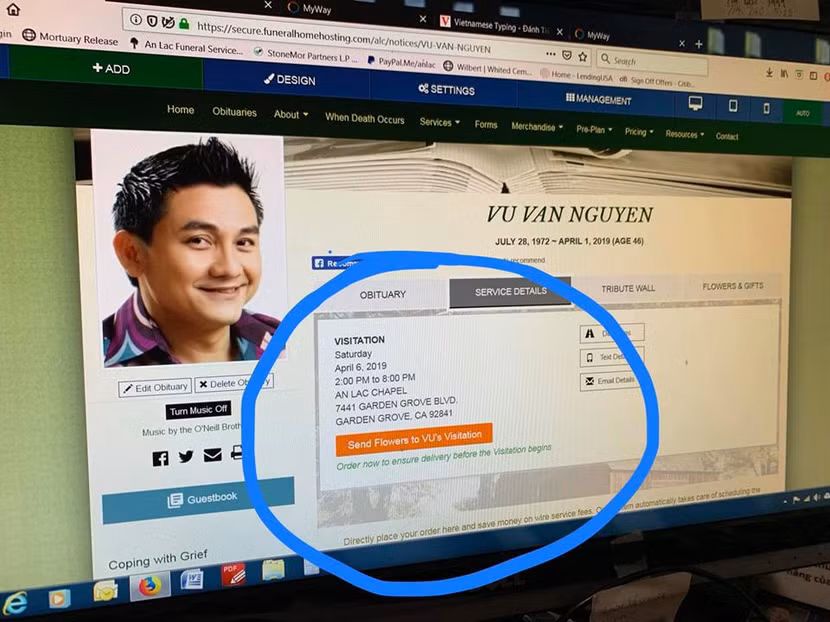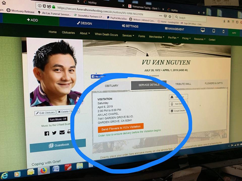 Thi hài Anh Vũ đã được đưa về nhà quàn An Lạc tại quận Cam