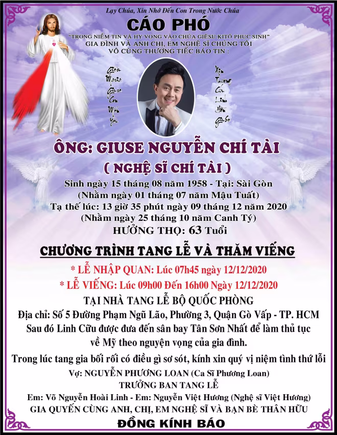 Thông tin về lễ tang của Chí Tài cũng được NSƯT Hoài Linh chính thức thông báo. Theo đó, lễ nhập quan sẽ diễn ra vào 7h45 ngày 12-12-2020, sau đó lễ viếng sẽ diễn ra từ 9h đến 16h cùng ngày tại Nhà tang lễ Bộ Quốc Phòng (số 5 đường Phạm Ngũ Lão, P3, Q.Gò Vấp, TP.HCM). Sau đó linh cữu của Chí Tài sẽ được đưa ra ra sân bay Tân Sơn Nhất làm thủ tục về Mỹ theo nguyện vọng của gia đình.