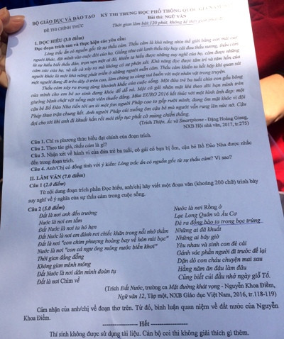 Đề thi bao gồm phần làm văn chiếm số điểm cao nhất: 7 điểm. Trong đó 5 điểm được dành cho câu hỏi đề cập đến đoạn trích trong tác phẩm Đất nước của tác giả Nguyễn Khoa Điềm khá quen thuộc với thí sinh.
