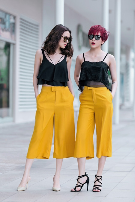 Quần culottes vàng nghệ kết hợp với áo hai dây lửng đen mang đến vẻ năng động và gợi cảm cho "song Thiều"