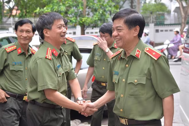 Tổng Biên tập Nguyễn Thanh Bình đón Thiếu tướng Đoàn Duy Khương tới trụ sở tòa soạn Báo An ninh Thủ đô chúc mừng