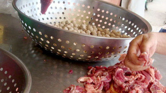 Một mẻ bò viên gồm 50 kg thịt bò nguyên liệu. Nói là thịt bò cho oai chứ thực chất chỉ là mớ thịt nát, gân, lòng và bạc nhạc có dính chút thịt. Nguyên liệu này được chồng chị Thúy mua từ một mối ở huyện Củ Chi, sau khi chủ lò giết mổ đã lọc hết phần ngon bán cho bạn hàng. Nhìn kỹ trong rổ thịt, có cả những con giun sán màu trắng đục nằm dài theo thớ gân mà nếu chúng không ngóc đầu ngọ nguậy thì ai cũng tưởng là gân bò. Cùng với 50 kg “thịt bò” kể trên là 15 kg thịt heo vụn, 10 kg mỡ heo và 20 kg mỡ cá tạp sẽ được trộn lẫn làm nguyên liệu chính.