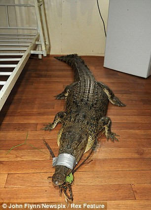 Các nhân viên sau đó có mặt đã dùng băng dính cột chặt con cá sấu