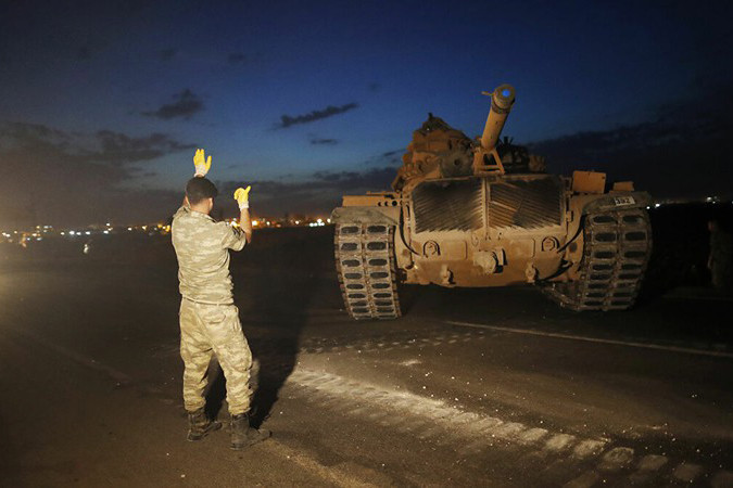 Binh sĩ Thổ Nhĩ Kỳ hướng dẫn xe tăng vào vị trí gần biên giới với Syria