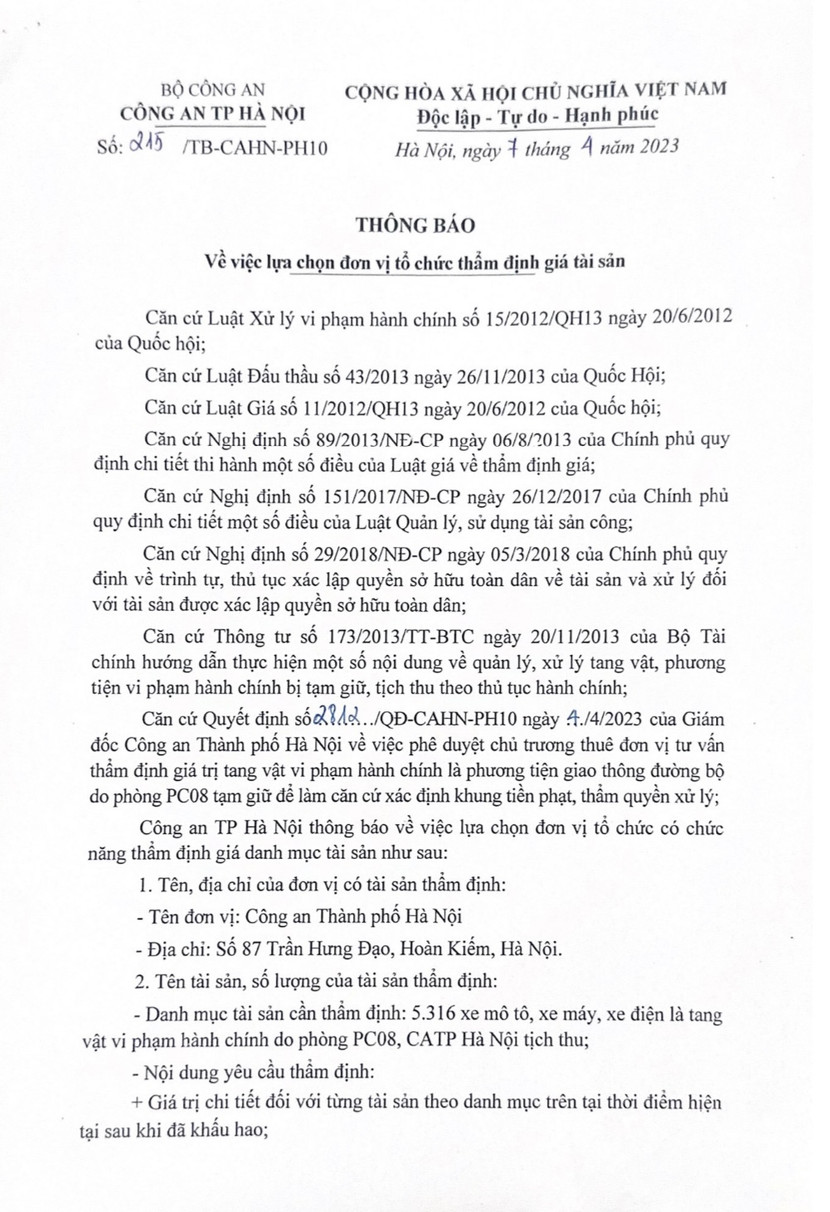 ANTD.VN - Thông báo về việc lựa chọn đơn vị tổ chức thẩm định giá tài sản của Công an TP. Hà Nội.
