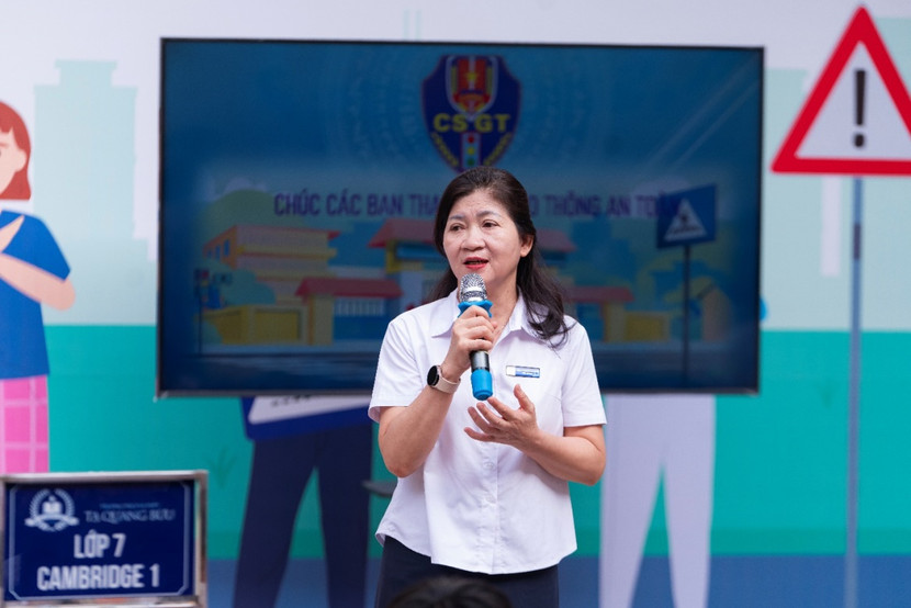 Thay mặt nhà trường, cô giáo Phạm Thị Xuân Hương – Hiệu trưởng – bày tỏ cảm ơn lực lượng Công an đã phối hợp tổ chức hoạt động bổ ích, thiết thực, đặc biệt trong bối cảnh khu vực cổng trường nhỏ hẹp, thường xuyên ùn tắc giờ tan học.