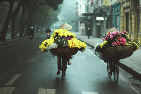 Hà Nội buổi sáng sớm, nổi bật nhất là những người bán hoa trên các tuyến phố cổ. Trời tờ mờ sáng, những chiếc xe đạp chở đầy hoa đã tụ tập trước cửa chợ Đồng Xuân, phố Hàng Giấy, Hàng Lược… Nào những cúc, những hồng, những ly… được xếp bày tạm thời trên lòng đường rồi được bó lại, phân ra chia phát khắp các ngõ phố. Trong ánh sáng mờ mờ giao điểm giữa đêm và ngày vẫn nhận thấy những màu sắc kỳ ảo của hoa. Kỳ ảo bởi sáng chưa rõ nhưng hoa không chịu nhạt đi màu sắc, hương vị của mình, vẫn rực rỡ vàng, đỏ trong bối cảnh khác lạ của trời đất. Thành phố mơ hồ trong một lớp sương mù. Ngày còn chưa rõ, đêm chưa chắc đã qua. Những người xuất hiện trong không gian ấy vừa lạ lẫm vừa quen thuộc trong khí đêm còn chưa tan hết.