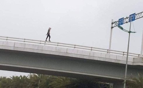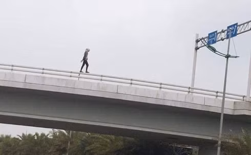 Hình ảnh cô gái đi bộ trên thành cầu trước khi nhảy xuống đất được người dân ghi lại