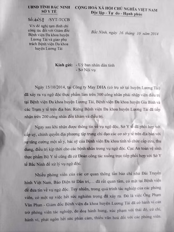Ngày 16-10, Nguyễn Hạnh Chung, Giám đốc Sở Y tế tỉnh Bắc Ninh cho biết, Sở Y tế đã ký công văn 1257/SYT-TCCB gửi UBND tỉnh Bắc Ninh và Sở Nội vụ về việc đề nghị tạm đình chỉ công tác với Giám đốc Bệnh viện Đa khoa Lương Tài.