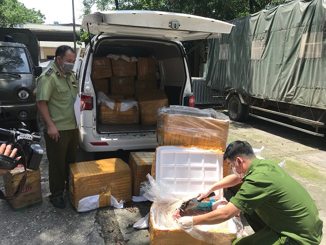 Tổ công tác đã lập biên bản, đưa người, phương tiện và hàng hóa về trụ sở để làm rõ. Qua kiểm đếm, lực lượng chức năng xác định trên xe có 20 thùng xốp, mỗi thùng khoảng 50kg, tổng số hàng khoảng trên 1 tấn nầm lợn. Số nầm lợn này được xếp thành được mảng, bọc trong nilon và bao tải gai trước khi đóng vào thùng xốp.