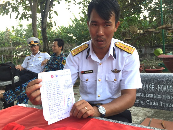 Thượng úy Nguyễn Văn Nam xúc động khi cầm trên tay lá thư của con gái là bài thơ viết tặng bố trước ngày anh lên đường ra Trường Sa làm nhiệm vụ