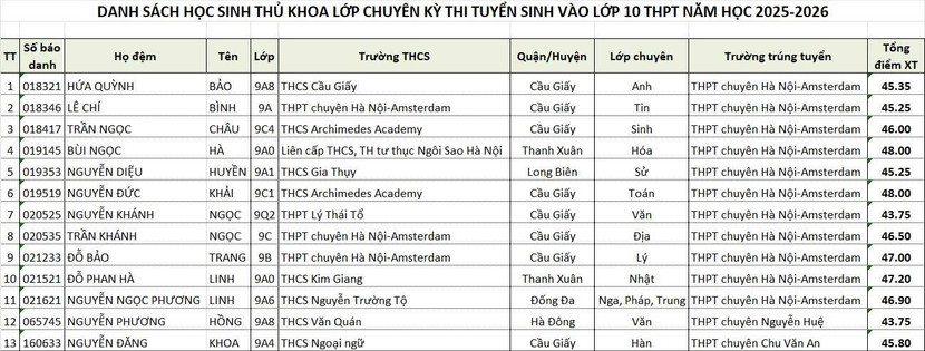 Với khối chuyên, thủ khoa năm nay đạt 48 điểm. Có hai thí sinh cùng đạt mức điểm này là em Bùi Ngọc Hà, học sinh trường liên cấp Ngôi sao và em Nguyễn Đức Khải, học sinh trường THCS Archimedes Academy.