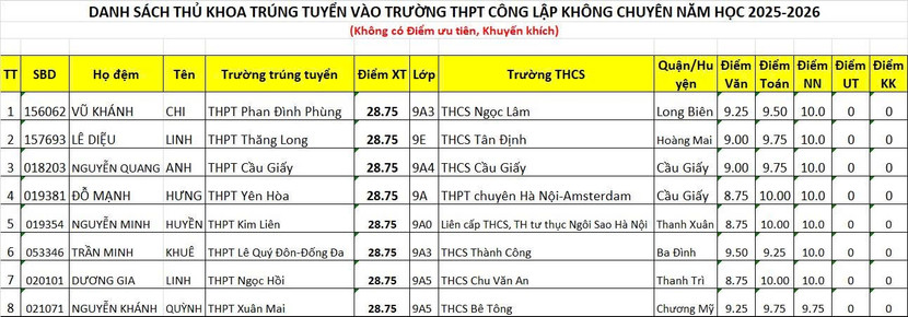 Cũng theo Sở GD-ĐT Hà Nội, năm nay có tới 8 Á khoa với mức điểm 28,75.