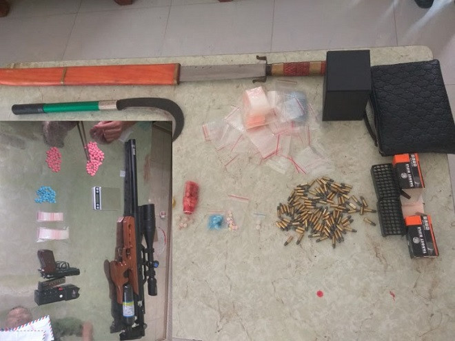 Tại nhà Nguyễn Hữu Bảo, cơ quan Công an thu 170 viên ma túy tổng hợp, 2 khẩu súng, 7 viên đạn, 1 cân tiểu ly. Tại nhà Ngô Đình La, lực lượng chức năng thu giữ 98 viên đạn, 82 viên ma túy tổng hợp, đao, dùi cui cùng hàng trăm túi nilon dùng để chia nhỏ ma túy.