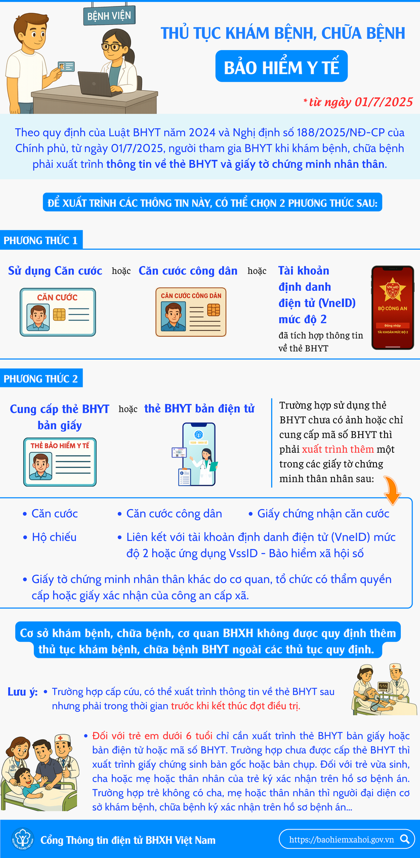 Bảo hiểm xã hội Việt Nam cho biết, theo quy định của Luật Bảo hiểm y tế năm 2024 và Nghị định số 188/2025/NĐ-CP của Chính phủ, từ ngày 01/7/2025, người tham gia bảo hiểm y tế khi khám bệnh, chữa bệnh phải xuất trình thông tin về thẻ bảo hiểm y tế và giấy tờ chứng minh nhân thân của người đó.