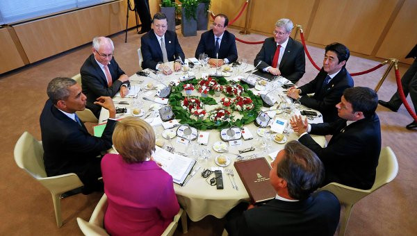 Nga gia nhập nhóm G7 vào năm 2008 và dự kiến sẽ tổ chức hội nghị thượng đỉnh G8 tại Sochi vào ngày 4/5/2014. Tuy nhiên, cuối tháng 3/2014 trong một cuộc họp, các nhà lãnh đạo của 7 cường quốc đã quyết định loại Nga ra khỏi G8 và từ chối tham dự hội nghị thượng đỉnh an ninh hạt nhân ở Sochi. Đây là một động thái nhằm trừng phạt Tổng thống Vladimir V. Putin vì đã sáp nhập Crimea vào Nga. Bên cạnh đó, phương Tây cũng đưa ra lời đe dọa sẽ sử dụng những biện pháp cứng rắn hơn nếu ông Putin leo thang hành động bất hợp pháp tại Ukraine.