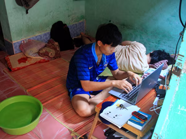 Sinh viên thuê nhà trọ chọn giải pháp tránh nóng bằng đặt chậu nước trước quạt điện