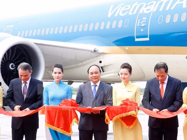 Thủ tướng Nguyễn Xuân Phúc và các đại biểu cắt băng khai trương đường bay của Vietnam Airlines tại Cảng hàng không quốc tế Cát Bi-Hải Phòng. (Ảnh: TTXVN)