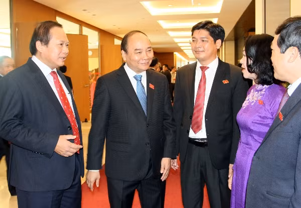 Thủ tướng Nguyễn Xuân Phúc trao đổi với các ĐBQH bên hành lang Quốc hội