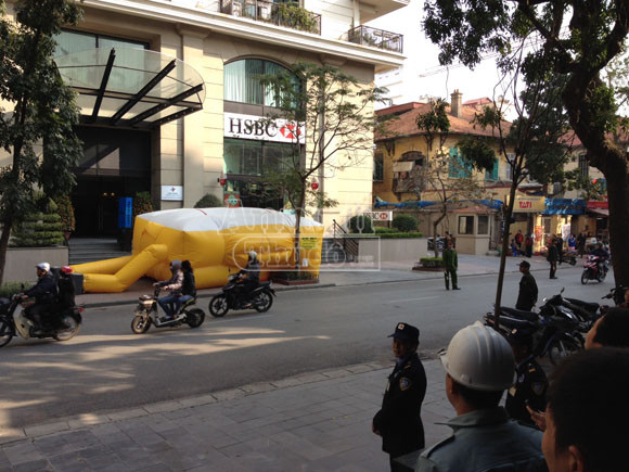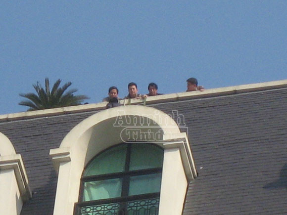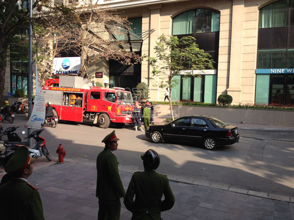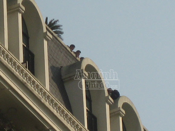 Thông tin nhanh chóng được trình báo đến cơ quan công an. Lực lượng CS PCCC nhanh chóng điều 1 xe cứu hoả, xe thang, phong toả đoạn đường Phan Bội Châu, từ phố Lý Thường Kiệt - Trần Hưng Đạo. Đệm hơi được thiết lập ngay trên vỉa hè, đề phòng người này quẫn trí nhảy xuống. Tuy nhiên, với độ cao như vậy, nếu liều lĩnh nhảy xuống, rất khó để người này thoát khỏi nguy cơ tử vong.