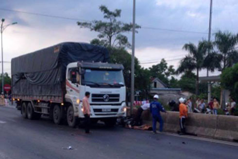 Tại hiện trường chiếc xe máy bị nát phần đầu nằm cạnh dưới bánh trước xe tải. Trên mặt đường xuất hiện vết phanh dài hàng chục mét của chiếc xe tải.