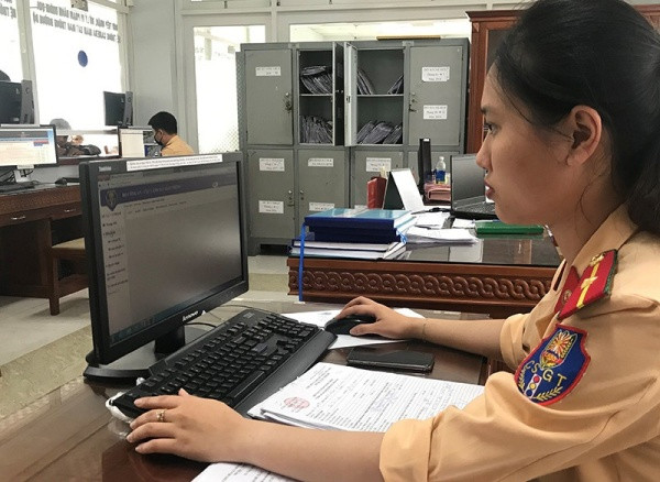 CSGT nhập dữ liệu vi phạm lên Cổng dịch vụ công Quốc gia nhằm phục vụ cho việc nộp phạt trực tuyến, giúp người dân thuận tiện trong xử phạt