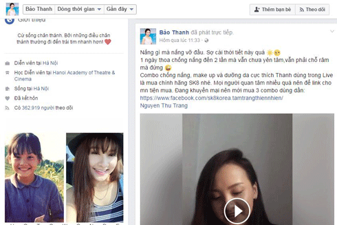 Đặc biệt, cũng từ khi nổi tiếng, nàng dâu trong “Sống chung với mẹ chồng” cũng tích cực đăng tải những dòng trạng thái, hình ảnh, thậm chí “livestream” (phát trực tuyến) trên trang Facebook của mình để giới thiệu với mọi người về các sản phẩm mà Bảo Thanh tiết lộ rằng cô đang sử dụng, từ thực phẩm bổ sung tăng sức đề kháng, viên uống trắng da, kem chống nắng… Tất nhiên kèm theo đó luôn là thông tin cụ thể về nơi hoặc người bán những sản phẩm này.