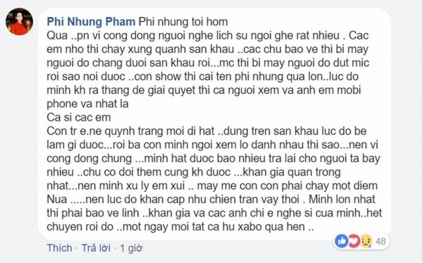 Sau khi trở về an toàn, Phi Nhung cũng chia sẻ thêm về sự việc này, cô cho biết tuy chương trình này không phải đêm diễn riêng của mình nhưng tên của cô trong show diễn quá lớn nên cô quyết định ra thẳng sân khấu để giải quyết, tránh để xảy ra xô xát không đáng có. Nữ ca sĩ giãi bày, khán giả là quan trọng nhất nên cô muốn xử lý êm mọi chuyện.