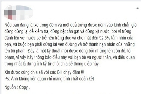 Nội dung cảnh báo được nhiều người dùng Facebook chia sẻ rằng: Nếu đang đi xe ô tô ban đêm và bị ném trứng vào kính chắn gió thì không được dừng lại, không xịt nước và bật cần gạt mưa để làm vệ sinh, vì “trứng và nước sẽ che hết tầm nhìn” của người lái, khiến chủ xe phải dừng lại ven đường và trở thành… “nạn nhân của những kẻ côn đồ”. Đoạn cảnh báo thậm chí còn khẳng định đây là “kỹ thuật mới của những tên côn đồ”.