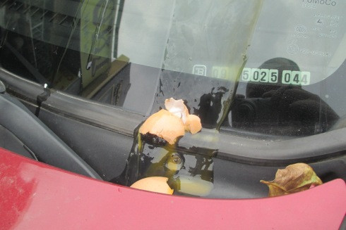 Đợt 1 chỉ ném 1 quả trứng vào vị trí kính của người lái, sau đó tiến hành xịt nước, bật gạt mưa để kiểm tra. Đợt 2 ném 3 quả trứng vào 3 vị trí khác nhau trên kính, để toàn bộ kính bị “phủ” trứng, sau đó lại xịt nước, bật gạt mưa.