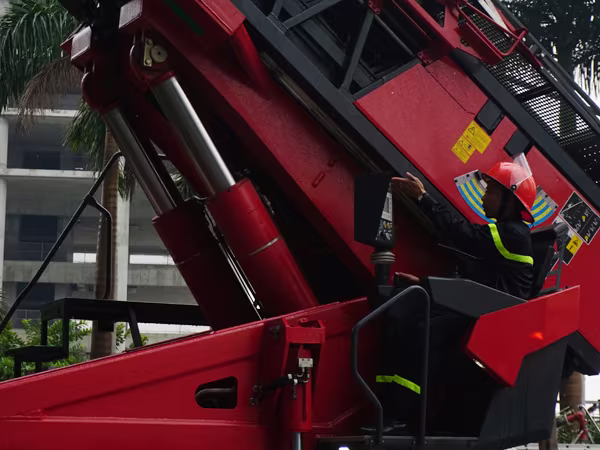Một chiến sỹ điều khiển nâng xe thang lên cao cứu nạn