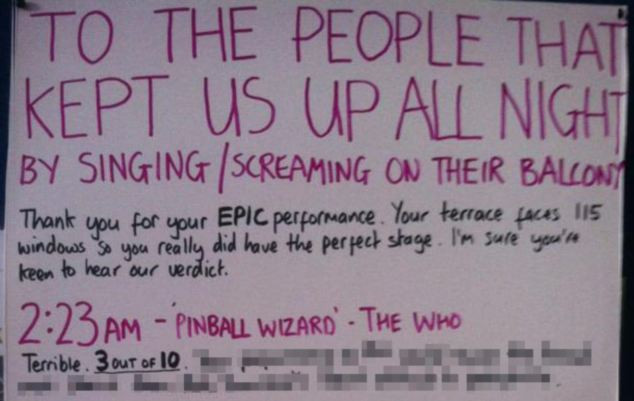 Anh Oli Beale, 33 tuổi, làm việc trong ngành quảng cáo, sống tại thủ đô Lon Don, nước Anh đã viết bản “đánh giá” rồi dán lên một bảng đọc báo công cộng ở khu vực anh đang sinh sống và gửi cả lên mạng Twitter. Bản nhận xét có tiêu đề: “Gửi những người khiến chúng tôi khỏi ngủ suốt đêm bằng lời ca, tiếng hét trên ban công”.