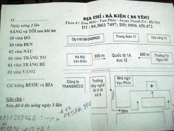 Cách sử dụng bài thuốc như thế nào? Phần ghi chú về hướng dẫn sử dụng thuốc ghi rõ: ngày uống 2 lần sáng và tối sau khi ăn, mỗi lần uống “10 viên đỏ, 10 viên đen, 2 viên nâu, 1 viên trắng to, 1 viên trắng bé, 1 viên vàng, kiêng rượu và bia, nếu đỡ ít thì ngày uống 3 lần”… Hầu hết bệnh nhân đến cơ sở này đều được giới thiệu mua thuốc, do đó chắc chắn cũng đã có không ít bệnh nhân từng tin tưởng mua và sử dụng bài thuốc tiên này, còn hiệu quả ra sao thì chỉ người trong cuộc mới biết được.