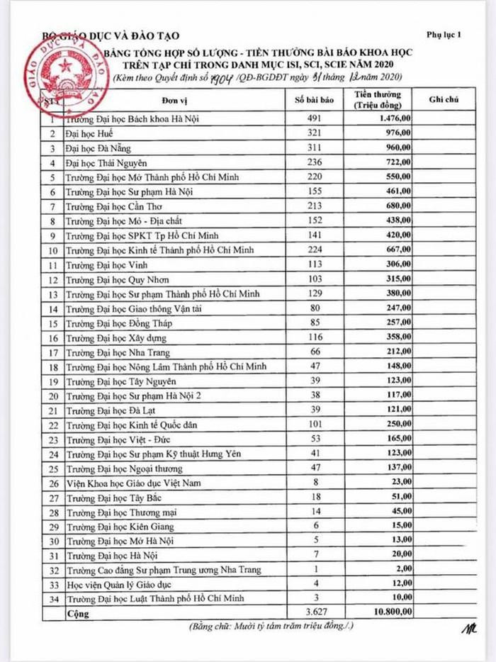 Bộ GD-ĐT đã có quyết định khen thưởng 34 đại học, trường đại học trực thuộc có bài báo khoa học trên các tạp chí trong danh mục: ISI, SCI, SCIE năm 2020, với tổng số tiền 10 tỷ 800 triệu đồng.