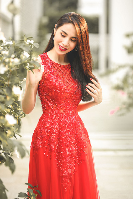 Chiếc váy đỏ ôm sát càng tôn lên đường cong quyến rũ của bà mẹ một con Thủy Tiên
