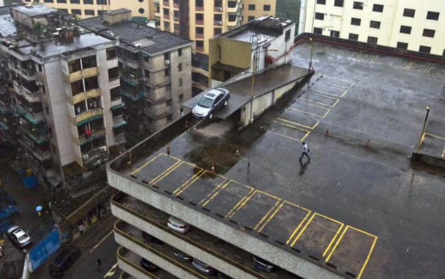 Sau khi tìm được chỗ đỗ xe “miễn phí”, lái xe này đã rời đi. Sáng hôm sau, đội thanh tra của khu vực đỗ xe tỉnh Quảng Đông, phía Nam Trung Quốc đã phát hiện ra một chiếc ôtô được đỗ trên một dốc mái, với gần một nửa phần trước của nó treo lơ lửng trên không.