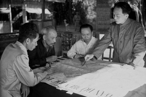 Đại tướng Võ Nguyên Giáp (phải) trình bày với Chủ tịch Hồ Chí Minh và các đồng chí lãnh đạo Đảng, Nhà nước bàn kế hoạch mở chiến dịch Điện Biên Phủ năm 1954