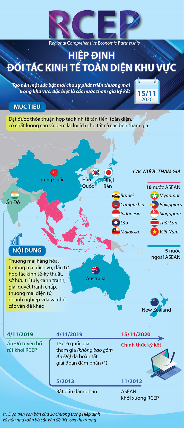 Khuôn khổ hợp tác mới của Hiệp định Đối tác Kinh tế toàn diện khu vực (RCEP) được ghi nhận sẽ góp phần đưa ASEAN sẽ trở thành đối tác năng động, mạnh mẽ, hợp tác vì sự thịnh vượng chung. Sự tham gia ký kết Hiệp định RCEP cũng được coi là dấu mốc quan trọng trong tiến trình hội nhập kinh tế toàn cầu của Việt Nam.