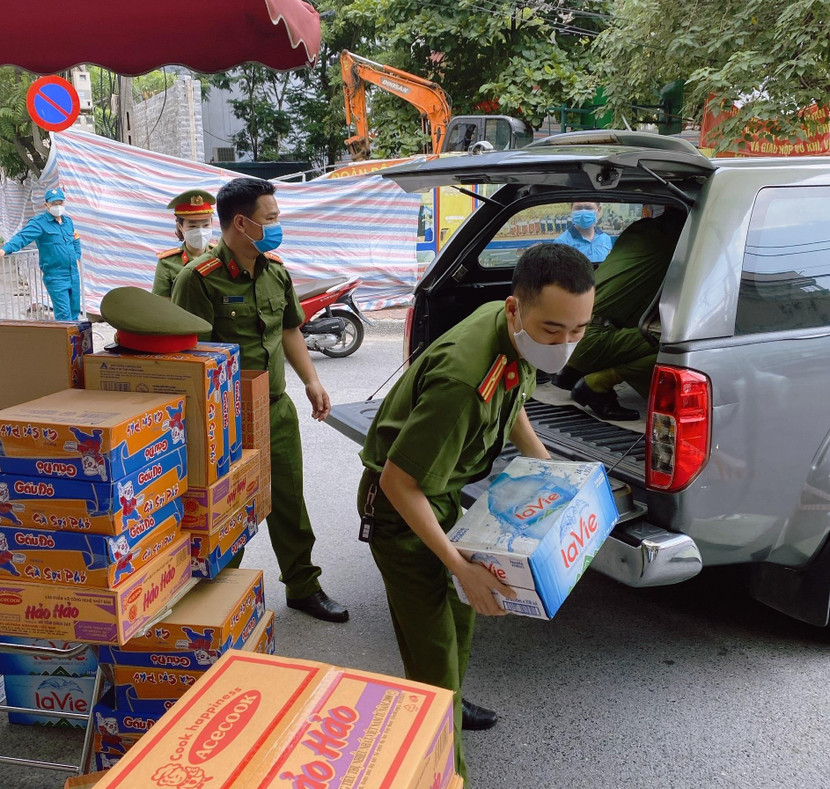 | CBCS 2 đội nghiệp vụ Công an quận Đống Đa vận chuyển những thùng nước, mì để gửi tặng đồng chí đồng đội và nhân dân đang làm nhiệm vụ chốt phòng dịch |