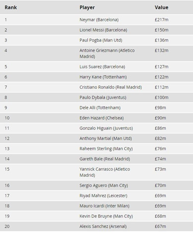 Top 20 cầu thủ giá trị nhất thế giới
