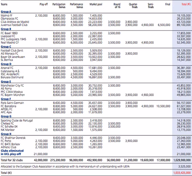 Mỗi đội bóng nhận được ít nhất 8,6 triệu euro cho thành tích dự vòng bảng. Các đội sau đó được thưởng 1 triệu euro cho mỗi trận thắng và 500.000 euro cho mỗi trận hòa.